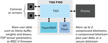 The Efinix Ti60 F100, which is shipping today, packs 60K worth of logic and high-speed I/O that are configurable for a variety of protocols, in addition to integrated SPI flash and HyperRAM, all wrapped into a tiny 5.5 mm square package with a 0.5 mm ball pitch. The combination of FPGA logic and data storage makes the Ti60 F100 a great solution for a variety of camera and sensor systems. With the SPI flash, designers can eliminate the need for a separate configuration device, while the HyperRAM memory can store user data. Customers can use the HyperRAM as a frame buffer for video, to store weights and biases for AI, to store parameters for time-of-flight (TOF) sensors, or to hold firmware for a RISC-V SoC. More information on the Efinix platform can be found at Titanium Ti60 F100