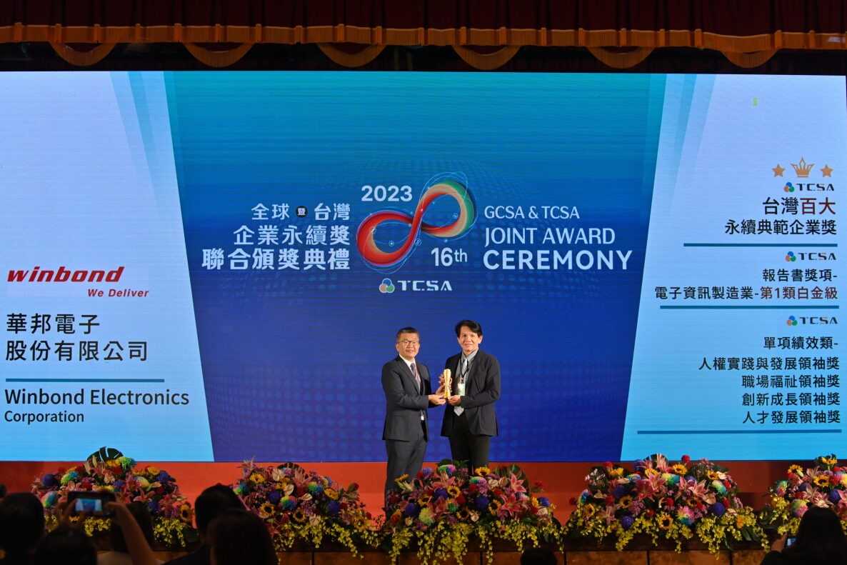 Winbond was recently awarded six honors at the "TCSA Taiwan Corporate Sustainability Awards" organized by the Taiwan Institute for Sustainable Energy (TAISE), and also recognized with the "2023 BSI Sustainable Resilience Excellence Award" from the British Standards Institution (BSI). These recognitions showcase Winbond's achievements in balancing ESG (Environmental, Social, and Governance) aspects and operational resilience. The "TCSA Taiwan Corporate Sustainability Awards" evaluates companies' ESG sustainability performance through comprehensive and international standards, and Winbond consistently receives accolades such as "Taiwan Top 100 Sustainable Corporate Award," "Corporate Sustainability Report Award – Platinum Level," "Talent Development Leadership Award," "Innovation Growth Leadership Award," and more. In 2023, Winbond was firstly honored with awards for " Human Rights Leadership Award" and "Workplace Wellbeing Leadership Award." On the other hand, The BSI, a global standard-setting organization, annually recognizes domestic companies committed to achieving net-zero and sustainable development. Already honored with the "BSI Sustainable Resilience Outstanding Award" two times in recent years, furthermore, Winbond was honored with the higher ranking "BSI Sustainable Resilience Excellence Award" in 2023 for the first time.