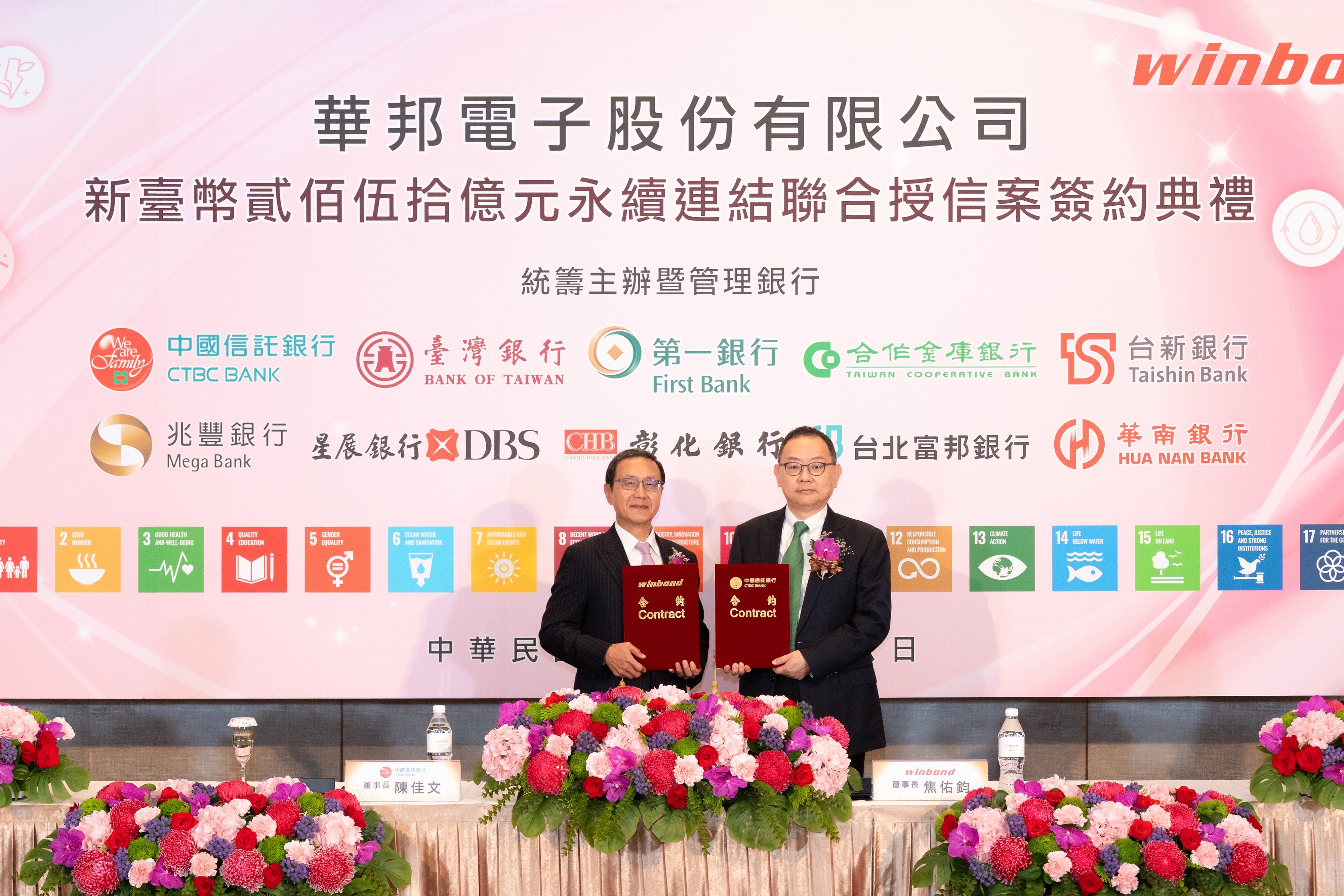 Taipei, Taiwan, R.O.C. – May. 08, 2025 – Winbond Electronics Corporation today held the signing ceremony for its NT$25 billion seven-year sustainability-linked syndicated loan at the Le Méridien Taipei. The event was jointly hosted by Mr. Arthur Yu-Cheng Chiao, Chairman of Winbond Electronics, and Mr. James Chen, Chairman of CTBC Bank. This syndicated loan is jointly arranged by CTBC Bank, Bank of Taiwan, First Commercial Bank, Taiwan Cooperative Bank, Taishin International Bank, Mega International Commercial Bank, DBS Bank (Taiwan) Ltd., Chang Hwa Commercial Bank, Taipei Fubon Commercial Bank, and Hua Nan Commercial Bank. In total, 17 financially sound institutions participated in this syndication.