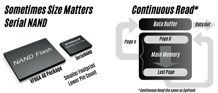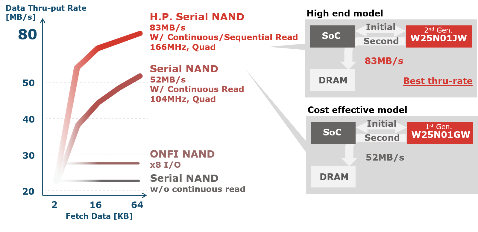 Compared to ONFI NAND flash, Winbond's QspiNAND Flash is offered in smaller package sizes, leading to significant cost savings in manufacturing processes, such as PCB cost and more. It makes the QspiNAND Flash a highly competitive product. If you are looking for reliable and affordable memory solutions, Winbond's QspiNAND Flash is the best choice for you. In addition to its cost-effectiveness, it also offers faster program and erase times, which can greatly enhance your overall system performance. Our QspiNAND Flash features the "continuous read" functionality, which effectively transfers NAND contents to DRAM. This increases the efficiency of code shadowing, resulting in a notable improvement in system performance.