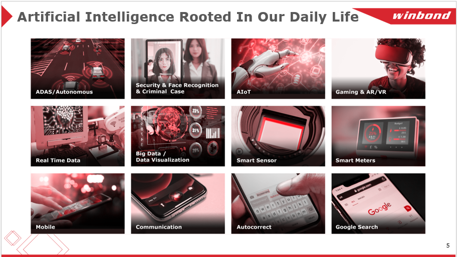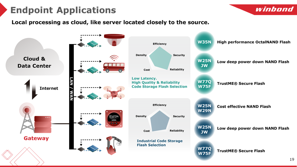 Winbond’s product portfolio, offers suitable options for AI applications including high-performance OctalNAND Flash W35N, the W25NJW series for low-power applications, and the security-related W77Q/W75F series of secure flash memory. The data transfer rate of Winbond QspiNAND Flash, for example, is about 83MB per second and the fastest speed of OctalNAND series is up to almost 3 times faster at almost 240MB per second.