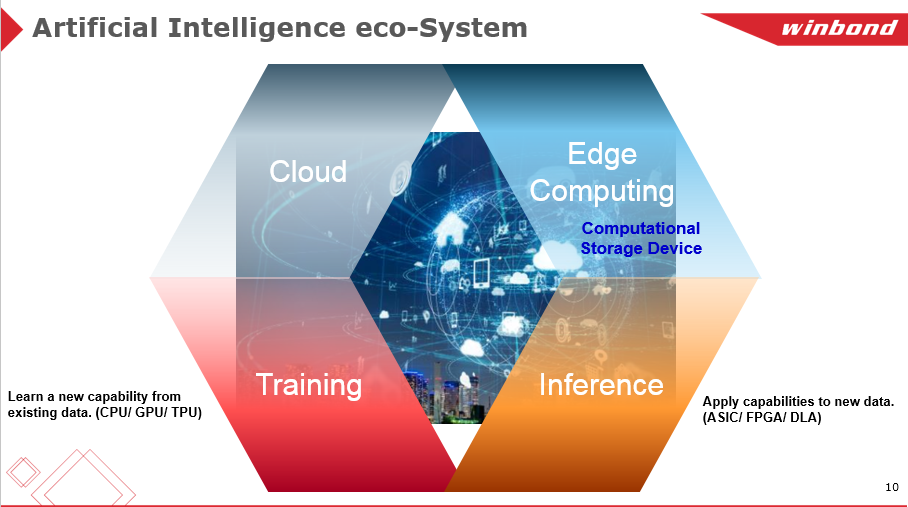 AI technology is divided into two categories; Training and Inference. Training is executed in the cloud by CPU, GPU, and TPU to continuously increase database resources for building data models. Inference relies on the trained data model and is more suitable for completing edge devices and specific applications. It is often processed by ASIC and FPGA chips.