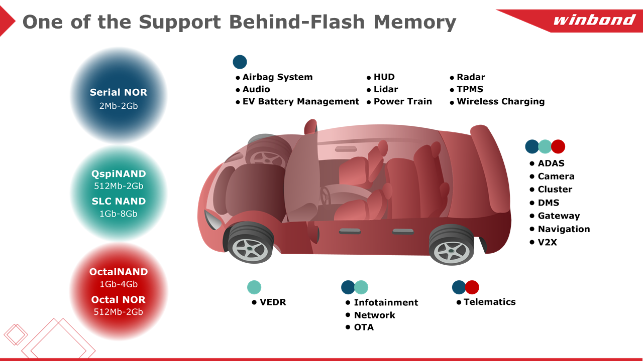 In addition, Winbond memory products are also suitable for many additional applications, including wireless communication systems, Lidar, tire pressure detectors, in-vehicle wireless charging systems, electric vehicle battery management systems, airbag systems, head-up displays, power management systems and audio systems; as well as the OTA wireless system covering network communication, infotainment and driving recorders. It can support V2X applications, car navigation, digital dashboard, driver monitoring and interactive systems, and it also can be used in gateways, cameras and other in-vehicle fields.