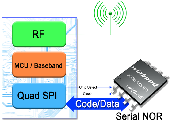 A serial Flash device can meet all the system’s storage needs: its memory address range can be divided into separate sections for code and for data. Firmware is stored in the code section, while the data section contains user data and configuration settings.