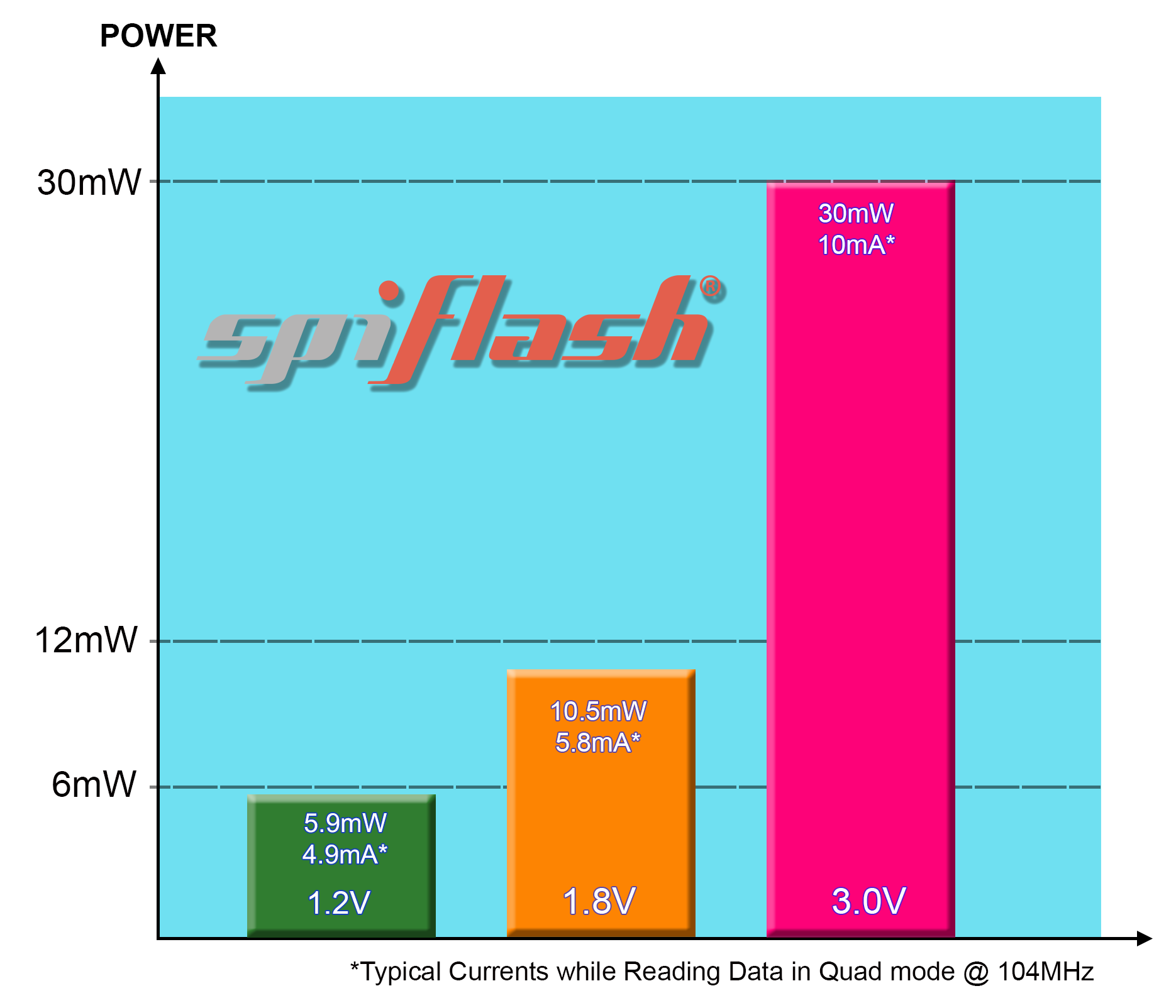 Fig. 3: Winbond serial NOR Flash ICs Active Read current performance ratings, including in green new 1.2V parts. (Image credit: Winbond)