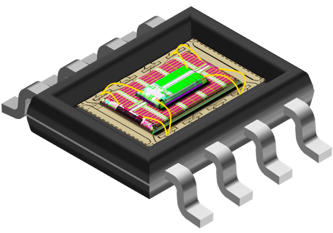 Fig. 1: a smaller NOR Flash die is stacked on top of a larger NAND Flash die. The dies and bond wires may be mounted to a leadframe or substrate. (Image credit: Winbond)