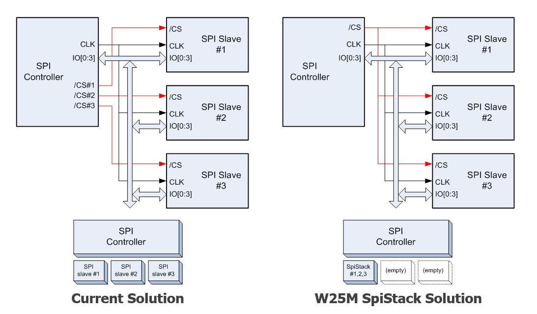 One of the main challenges in implementing a stacked-die product is the provision of interfaces between the SoC or microcontroller and the two (or more) dies inside the Flash memory package. To avoid contention on the SPI bus, the SoC uses a Chip Select (CS) command which tells the stacked package which die it wishes to interface to.