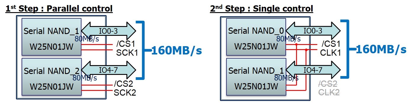Now Winbond has introduced the W25N01JW, a 1Gbit serial NAND Flash part which offers a maximum data transfer rate of 83MB/s - comparable with that of SPI NOR Flash devices. Even more impressively, the Winbond architecture supports an octo configuration - a two-chip dual quad serial interface which doubles the data transfer rate to a maximum of 166MB/s (see Figure 3).