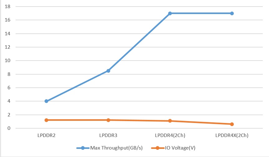LPDDR4/4x x32 has an almost double throughput than LPDDR3, same advantages as what LPDDR3 has with LPDDR2, shown in Fig.1. In power consumption, the IO voltage of LPDDR4x is 0.6(V), in contrast that LPDDR4 is 1.1(V). Although JEDEC has already published the latest LPDDR5 standard, the density of LPDDR5 just released into the market is still too high to be applied in the AIoTs. At this moment, LPDDR4x is still the best choice, if we need more AI computing power than what LPDDR3 could provide.