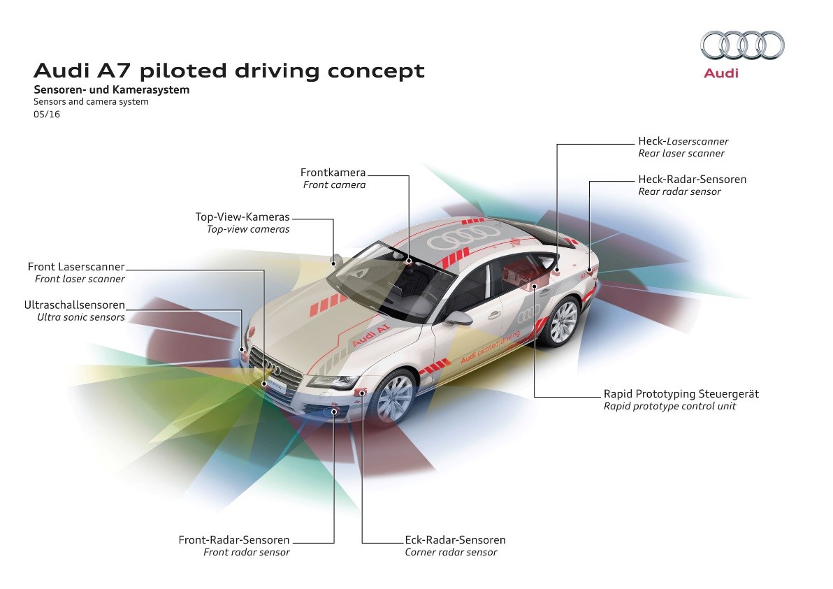 Fig. 1: Audi’s ‘piloted driving concept’ for its A7 model, showing the array of sensors in new car designs. (Image credit: AUDI AG)