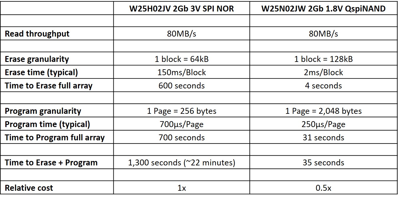 And for fast software updating, new Serial NAND Flash products have a clear advantage over the fastest SPI NOR Flash. Fast Write is an inherent feature of Serial NAND Flash – it is true, even without the application of proprietary acceleration techniques.