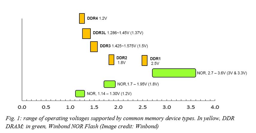 Fig. 1: range of operating voltages supported by common memory device types. In yellow, DDR DRAM; in green, Winbond NOR Flash (Image credit: Winbond)