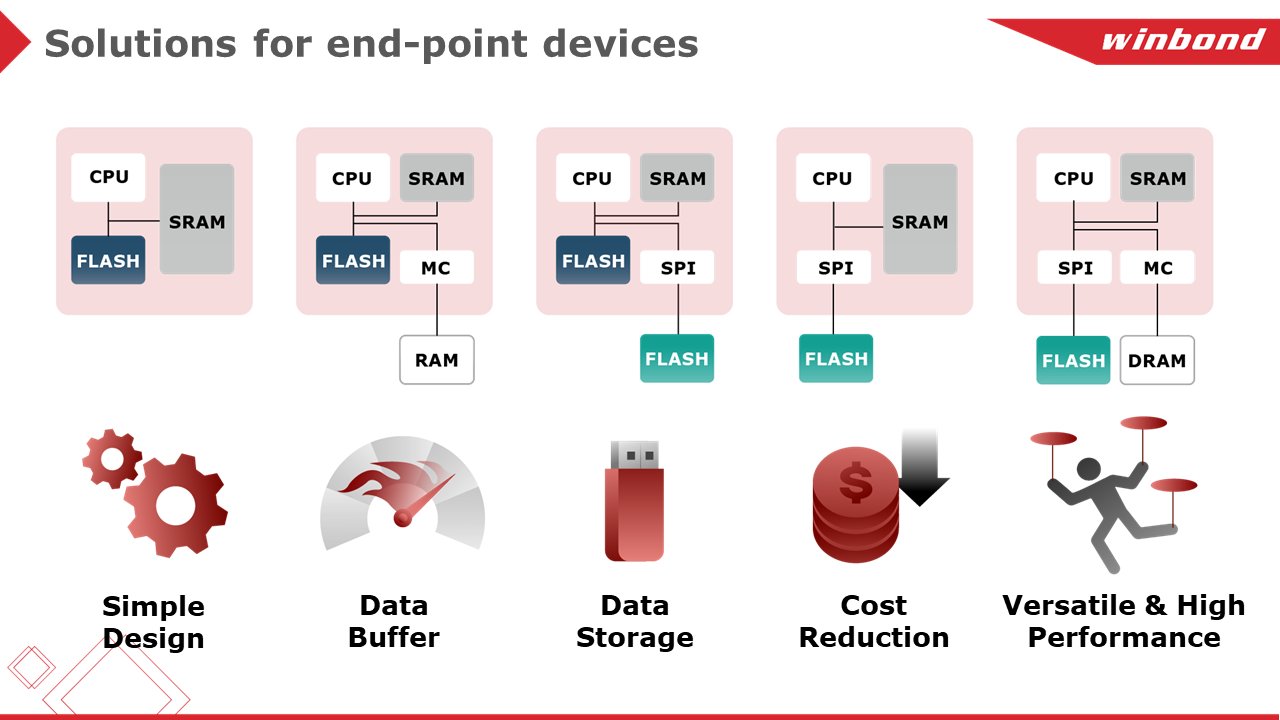 Terminal devices and cloud platforms rely on flash memory to maintain the system's functions. However, within such a large selection of flash memory offering different capacities, different operating temperatures or package sizes, and even different considerations for system security – it's difficult for systems designers to make the best choices. Winbond product planning helps customers meet their system requirements and optimize overall performance.