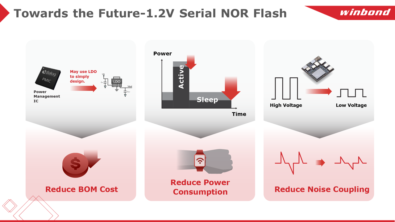 Winbond has now launched the industry's first 1.2V Serial NOR Flash, which helps systems use high-performance ASICs to reduce overall cost and power consumption effectively.