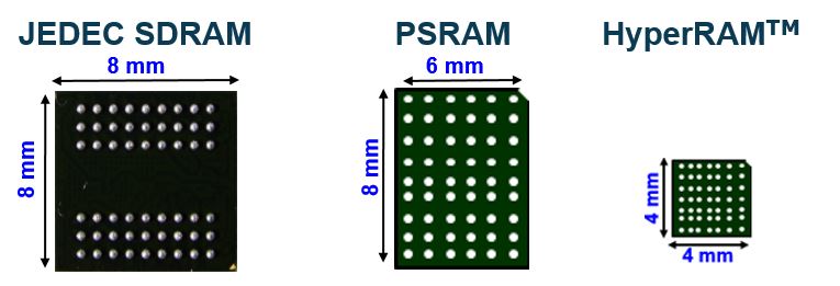 Owing to the fact that HyperRAM™ has been developed in recent years, it could utilize the newest semiconductor process node and package technology, which leads to its package size is smaller than any DRAM else . Fig.4 is the comparison between SDRAM size defined by JEDEC, PSRAM and HyperRAM™.