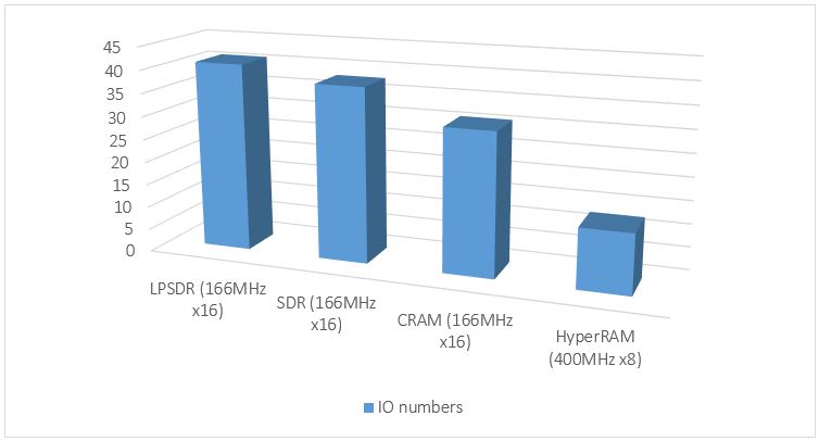 HyperRAM™ has only 13 signal IO pins, which can greatly simplify the PCB layout design. It also means that when designing end products, it allows MCU to have more pin out for other purposes or allows MCU with fewer pins for better cost-effectiveness. As Fig.2 shows, HyperRAM™ has fewest pins to achieve approximately the same throughput (333MB/s), compared to similar DRAM, like Low Power DRAM, SDRAM and CRAM/PSRAM.