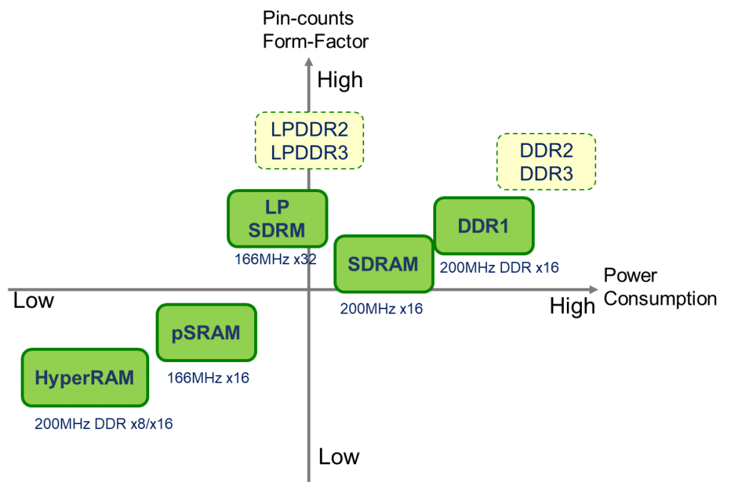 If Low Power SDRAM is adopted, the form factor is still bigger than HyperRAM™. That makes it not an ideal solution as Low Power SDRAM requires larger PCB area.