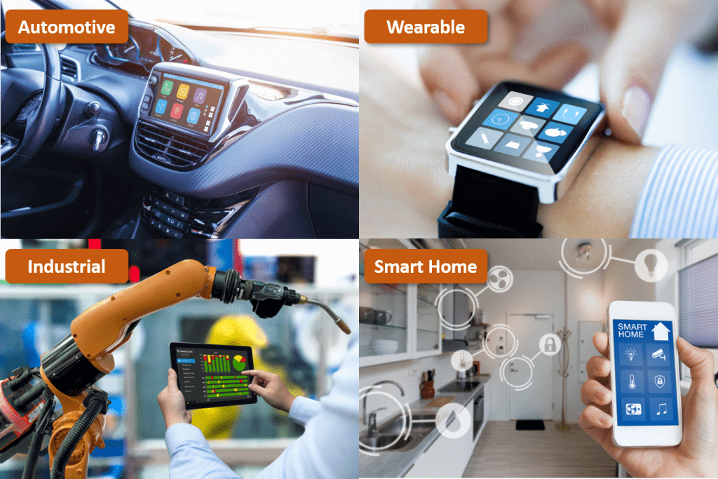 HyperRAM™ is especially for applications that require low power consumption and high MCU computing power in automotive, industrial 4.0, smart home and wearable markets, such as dashboardsHMI industrial control panels, smart home devices, voice control devices, bike computer and smart bands, etc.. Besides, for IoT edge device applications, various design considerations such as low cost, low power consumption, and computing efficiency also suit the characteristic of HyperRAM™.