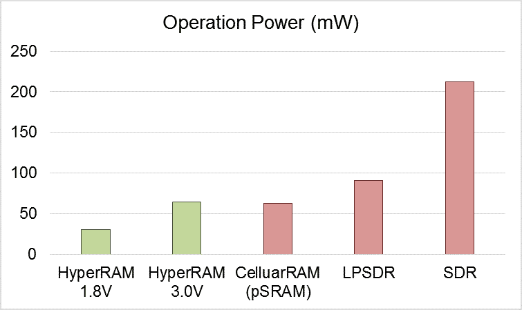 Fig. 3 The power consumption comparison between 64Mb HyperRAM™, LPSDRM, pSRAM and SDR on Operation mode (Source: Winbond)